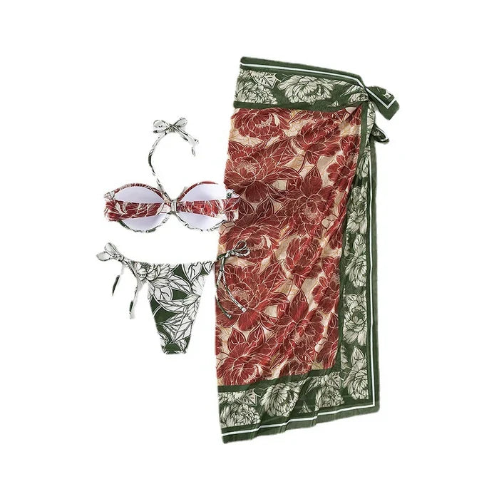 Unveil your summer charm with the High Waist Printed Three Piece Suit, crafted with a nylon and spandex blend. It offers a resilient, snug fit that accentuates your curves and ensures lasting wearability. Paired with a coordinating bikini top, this set stands out with its vibrant printed patterns, infusing your beach look with an artistic flair. Completing this trio is a versatile tie-around scarf, which opens up a world of styling options for you.